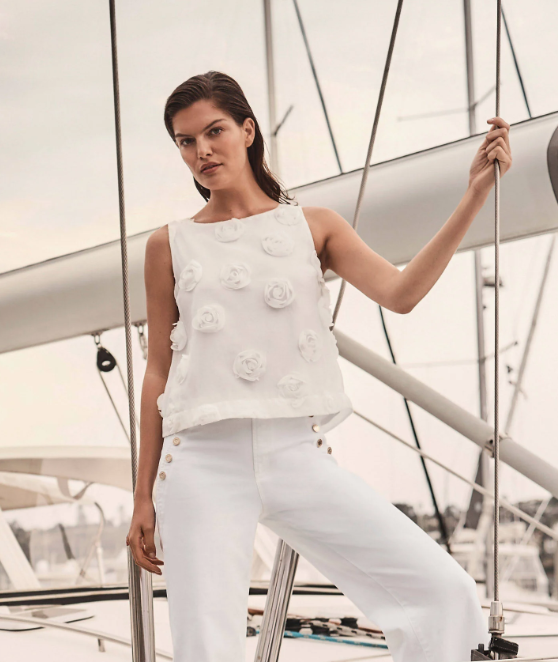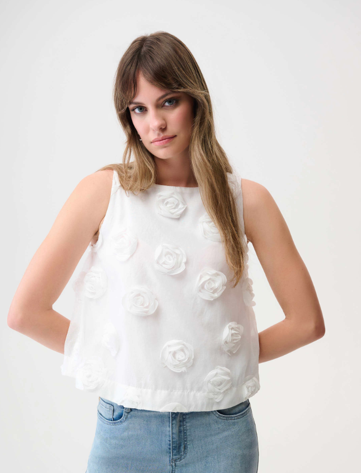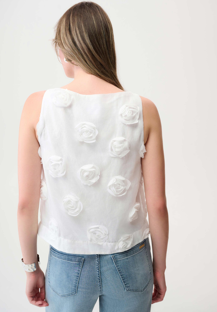 Charming and dimensional, this sleeveless straight top features a woven 3D floral texture, a clean boat neckline, and a sleek lined finish—perfect for adding subtle elegance to any look.