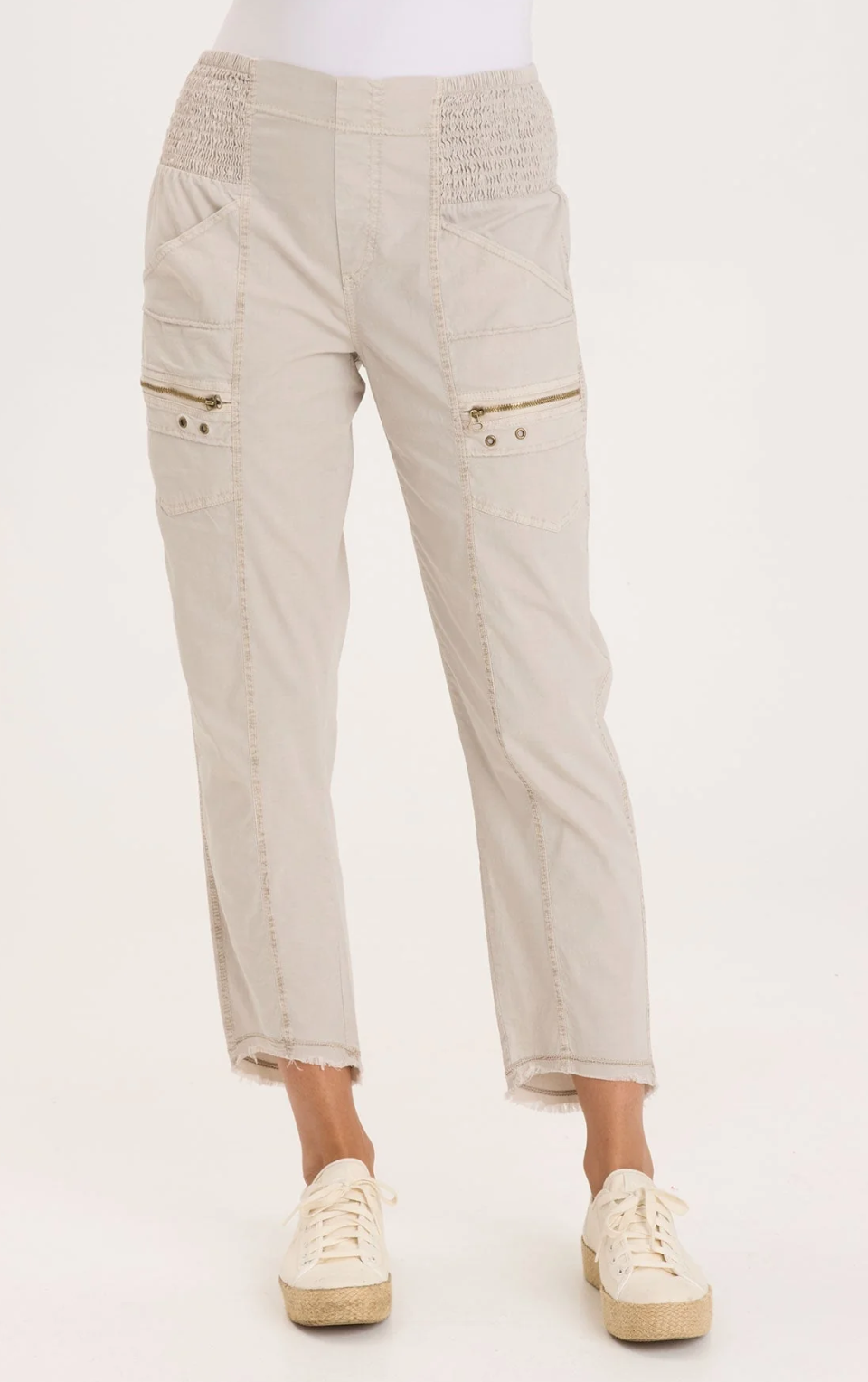 An ankle length slim fit pant with a pull on waist that features shirred panels, two inseam pockets, two patch zippered pockets, and a raw edge rounded hem.
