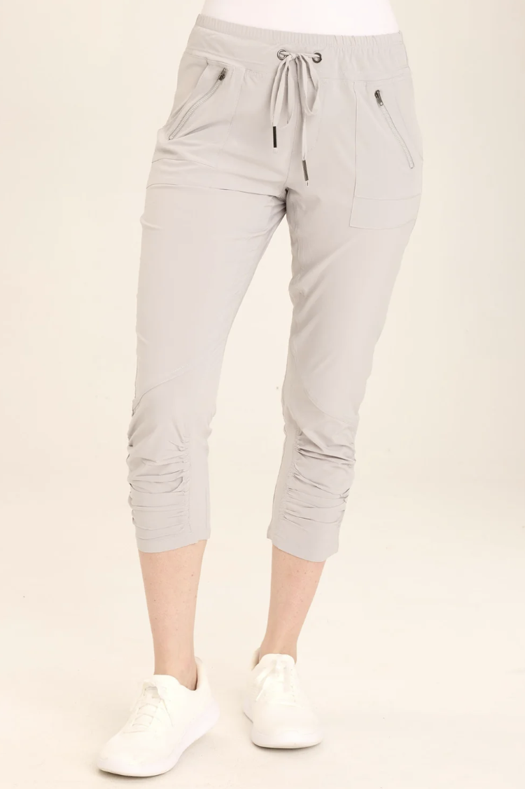 This active legging features a drawstring waist, front pockets with zipper details, our classic ruched leg panels, back pockets and enough sass to keep you going all day!