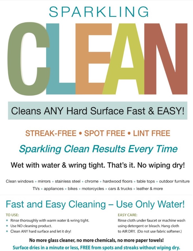 All your glass, mirrors, floors, counters, furniture, stainless, chrome.... anything non-porous will come shiny clean with the cloth and water alone! Wet the cloth, wring it out, and your ready to wipe - It polishes as it cleans with just water! The cloth is machine washable with soap and bleach. (Do not use fabric softener or your dryer on the cloth.) The cloth uses absloutely no chemicals to clean and leaves no lint or streaks behind.