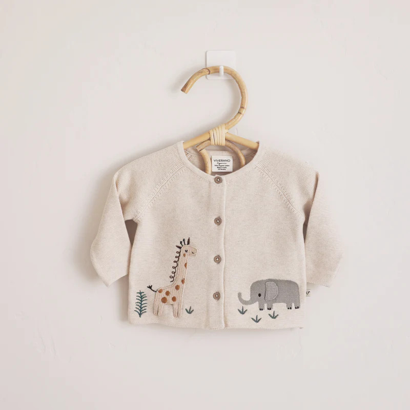 100% organic cotton sweater knit long sleeve cardigan with sweet & fun multi animal embroidery in front, super cute!