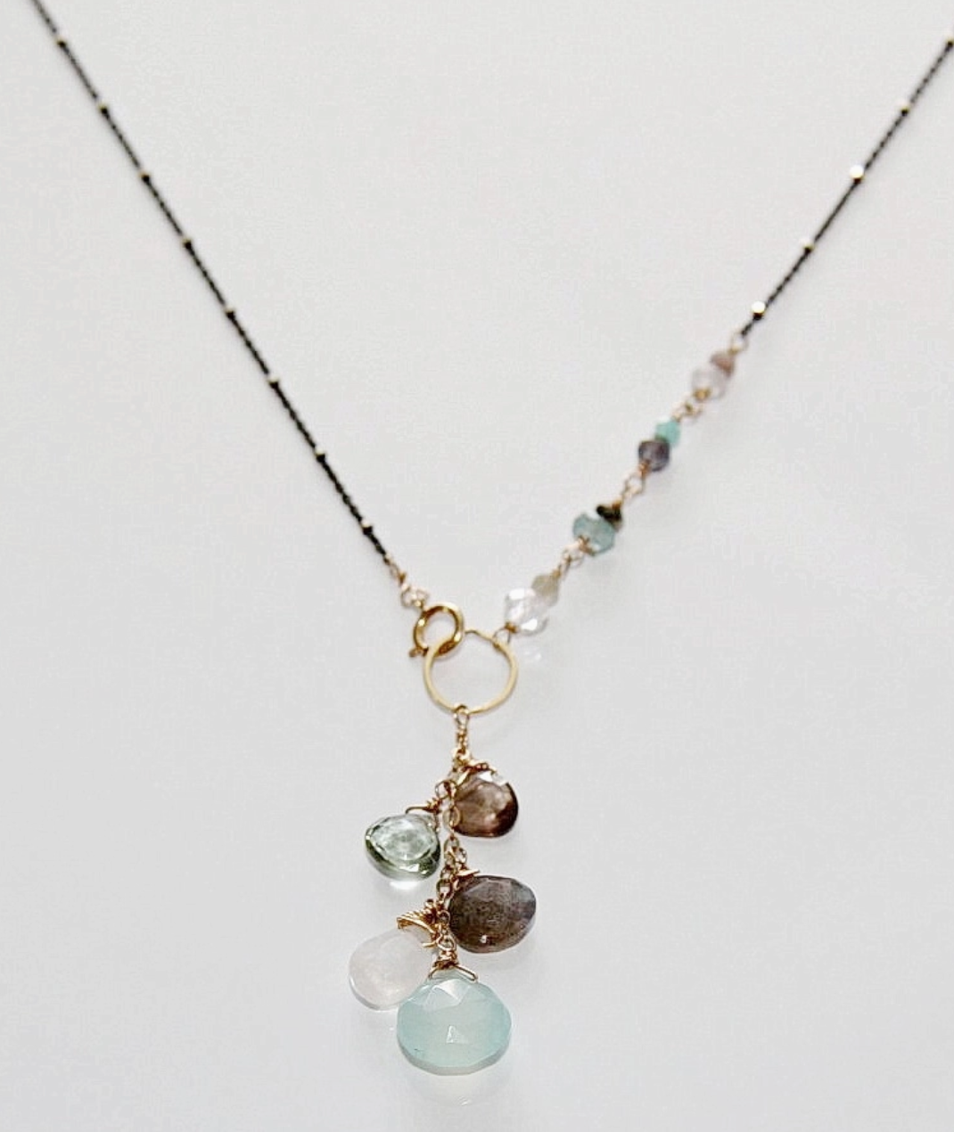 Asymmetrical front clasp mixed metal necklace in 14kt gold fill and gun metal sterling. Gems are Chalcedony, moonstone, smokey quartz, topaz, green amethyst, labradorite, apatite, and pyrite.