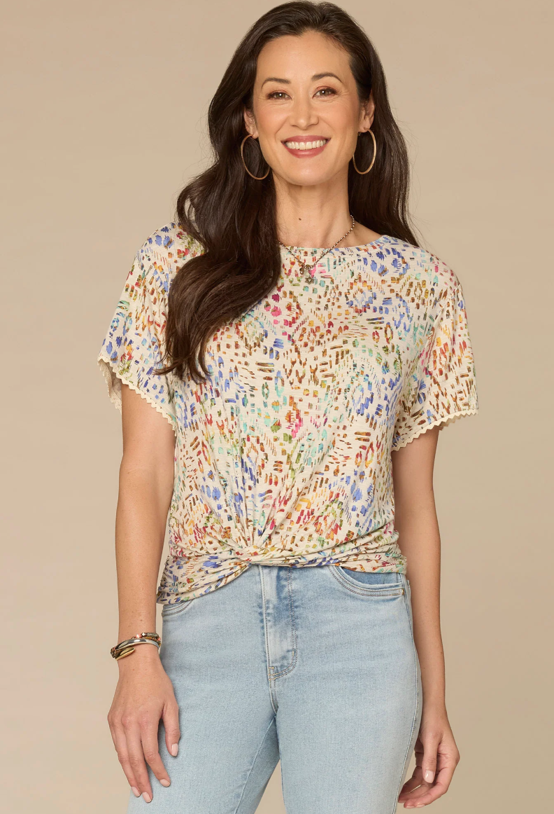 Add a pop of color to your look with this knit top. It has drapey short sleeves, a boat neck, flattering side twist hem, and a rainbow abstract print that draws the eye.