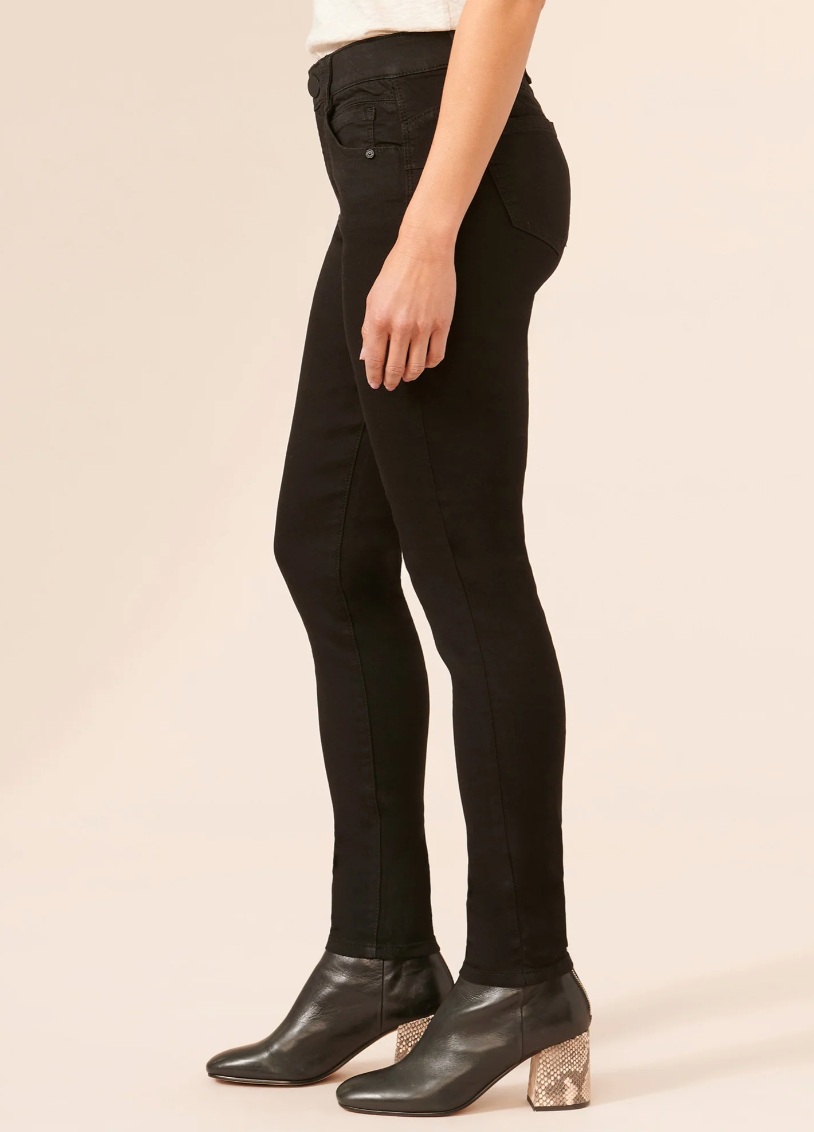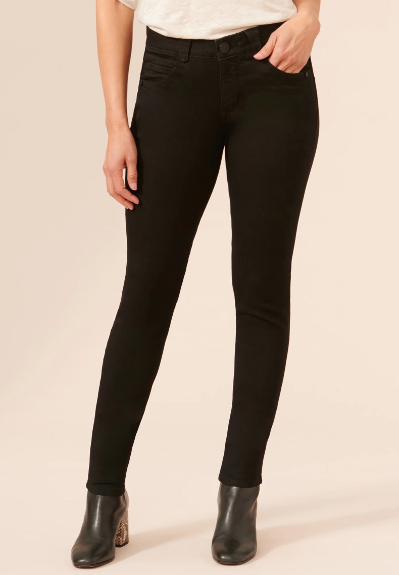 An exceptional fitting denim jegging with stretch. Style with almost any top for a fashionable look. Skinny leg bottom with “Ab”solution Technology ® is engineered to lift, expand, and enhance your shape to show off your positive assets and celebrate your curves. Constructed with slimming mesh panels to mold and hold your shape and provide tummy control that is also comfortable. No gap 1 3/4″ elastic waistband says goodbye to the muffin top waist and prevents rolling down with its stretchy, comfortable fit. Functional zip-fly with button closure. Fit is true to size.