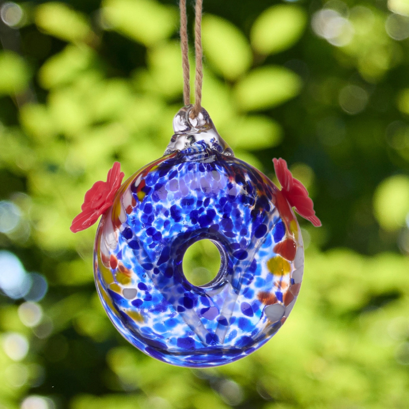 Artisan Glass Hummingbird Feeders are hand-blown, with each piece being unique in its dappled patterning. This cobalt blue double-port feeder is "donut" shaped, with a plastic flower feeding port on each side. Glass hummingbird feeders are easy to clean and resistant to staining due to the nonporous nature of the material - a gorgeous, low-maintenance feeder option.