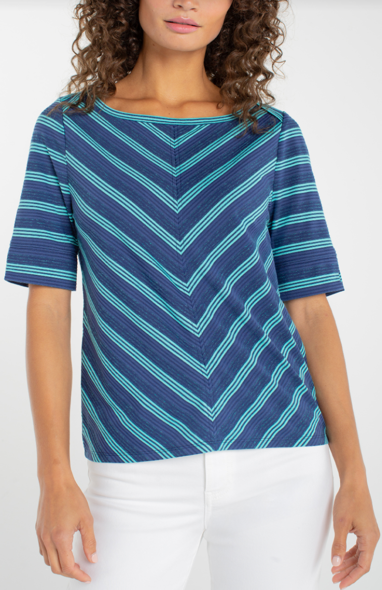 Effortlessly chic, this knit top features a fold-over boat neckline and flattering miter stripes that create a modern, elongating look. With half sleeves and a soft, comfortable feel, it’s perfect for everyday wear or polished casual outings.