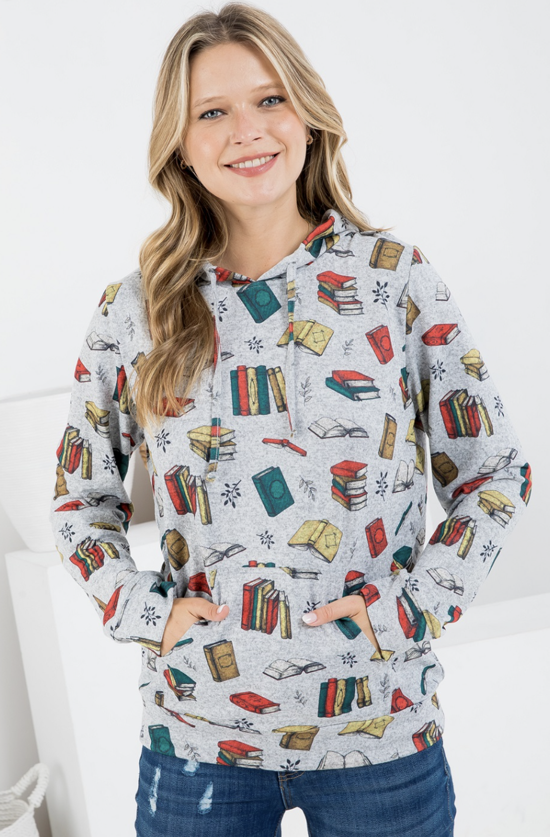 A soft and chic hoodie perfect for any booklover. Features a drawstring hood, front pocket, and book and reading design along the hoodie.