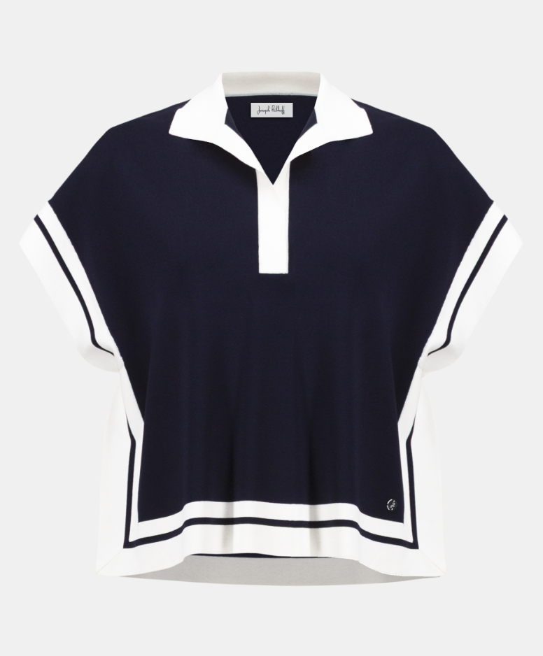 A captivating border stripe design graces this dry viscose and nylon yarn sweater, crafted in full needle stitch for texture and depth. The boxy fit, extended shoulder short sleeves, and contrast-colored polo collar offer a chic, modern silhouette, with side slits at the hem adding fluid movement.