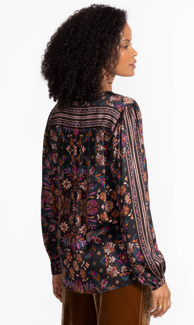 Crafted from a luxurious silk blend, the Curved Hem Prairie Blouse, is adorned with a kaleidoscope of brilliant color and pattern. Designed with a split V-and long sleeves, this colorful blouse is finished with a curved hemline and vibrant embroidered accents. Pair with flowing silk trousers and polished flats for an evening out with friends.