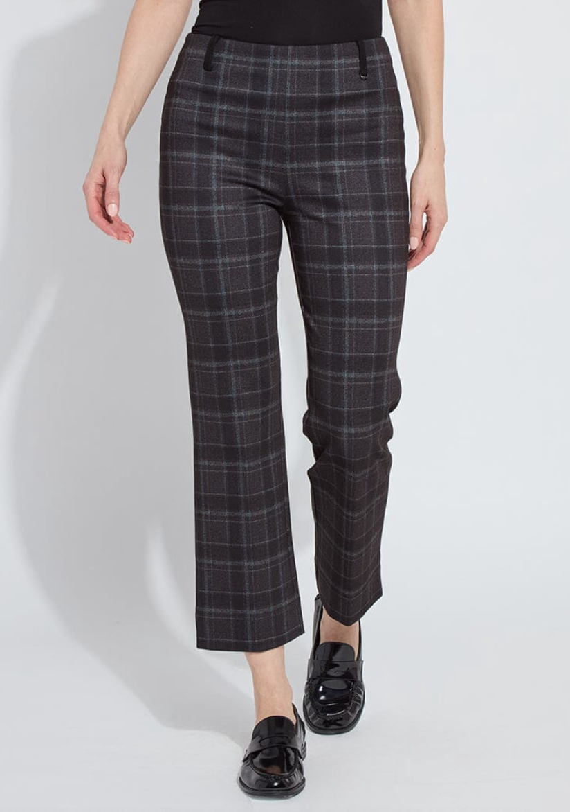 These ankle-length bootcut pants, made with 4-way stretch Ponte Jacquard, showcase Black Vegan Suede Trim, back pockets with metal studs, and side slits at the hem. These bootcut pants feature a concealed patented waistband, beltloops with a single charm, and pull-on styling. Style casually with the Aline Crew Neck Mix media Top and sneakers or dress them up with the Essential Longsleeve Turtleneck, Versatile Vegan Leather Blazer and ankle boots. Ponte Jacquard is more tightly knit than or signature Ponte, so size up if between sizes.