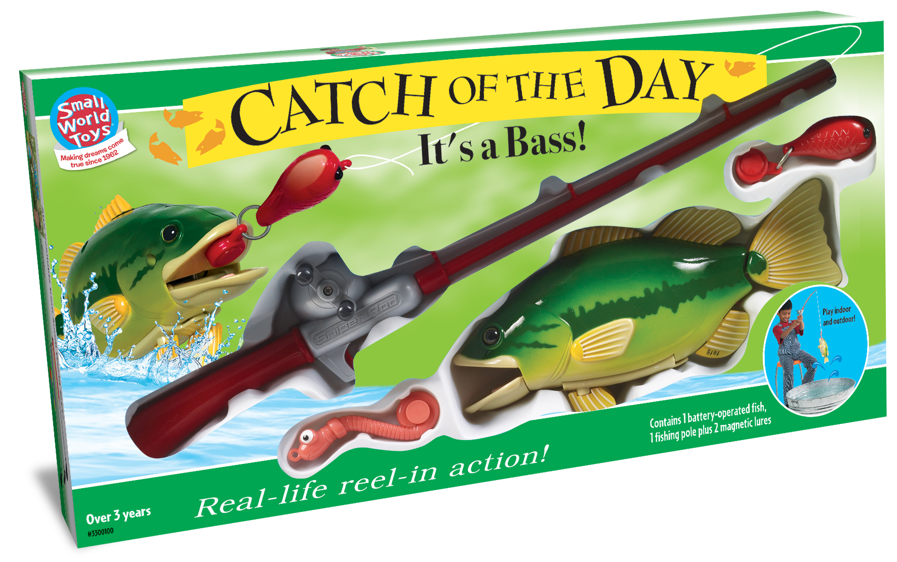 Bait the hook. drop the line and get ready for a bite this game has all the excitement of real bass fishing without leaving the house! Catch Of The Day has a working rod and reel with 2 lures and a battery-powered fish. The fish swims around gently until it is caught by getting the magnetic lure in its mouth. then it fights wildly just like a live bass! Kids love the realistic action. Perfect for pool or bathtub play.
