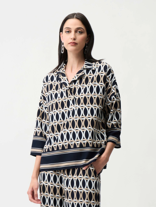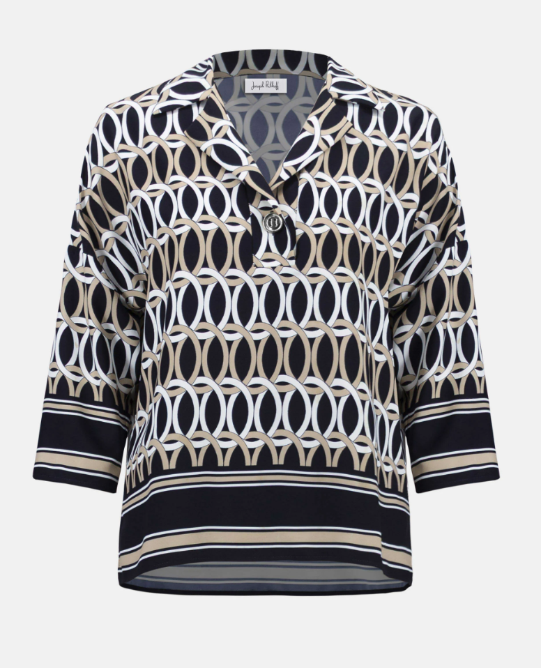 Bold yet refined, this recycled woven top showcases a luxe status chain border print, finished with a crisp shirt collar, single button detail, and relaxed dolman sleeves.