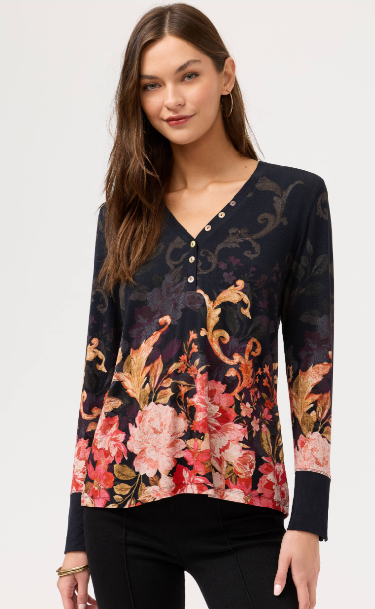 The Janie Favorite Henley Top is embellished with a vibrant floral pattern in hues of pink accented with tone-on-tone scrolls. Featuring a V-neck and long sleeves, this top is crafted from a lightweight breathable fabric. Pair with palazzo pants and colorful flats for a relaxed weekend ensemble perfect for time with family.