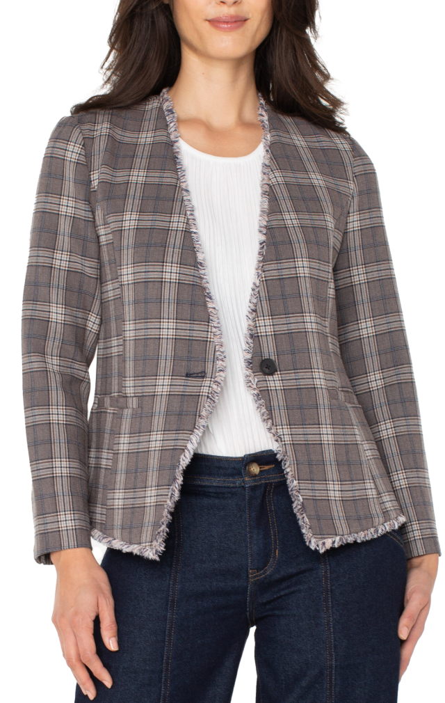 Tailored with a twist. This collarless blazer blends structure and subtle texture, featuring a streamlined silhouette, single-button closure, and softly frayed edges for a touch of modern ease. Fully lined and finished in a rich brown navy glen check, it’s a polished layer that feels refined, without feeling too buttoned up. Pair it with the matching trouser for a modern, put-together look—no effort required.