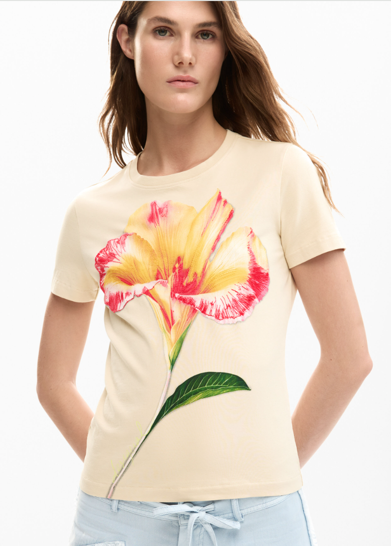 Regular-fit T-shirt with a front print of a hibiscus-style flower in an artistic style, with brushstroke effect.
