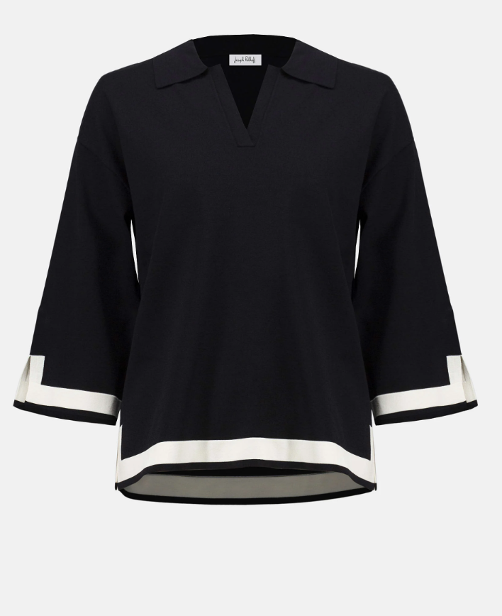 This sweater knit top gets a modern twist with contrast tipping, creating a subtle colour-block effect. A polo-style shirt collar, V-neckline, and three-quarter bell sleeves complete the design, striking the perfect balance of cozy and chic.
