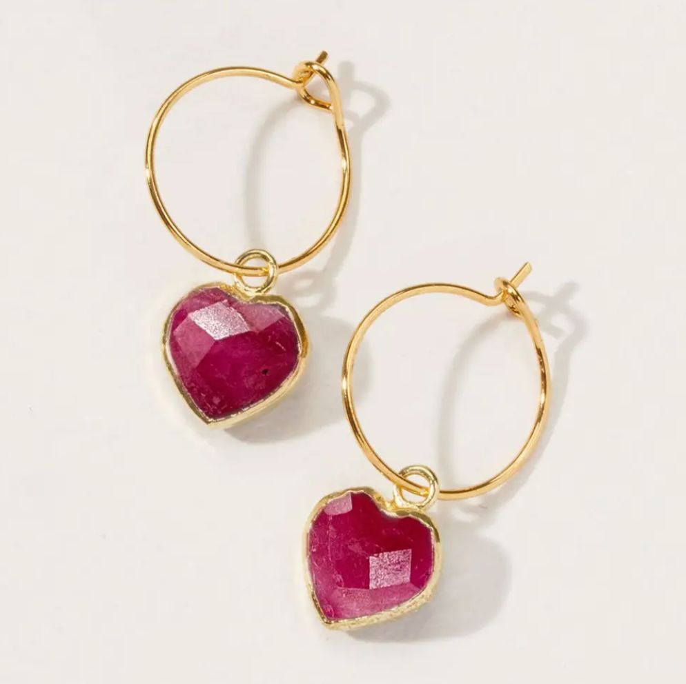 Love comes in all shapes and sizes. This trend-savvy update to our beloved Conversation Heart Necklace is sure to add a perfect touch of practical style to any ensemble. * 14KT Gold Plated Brass * Genuine Ruby * Hoop size: approx. 0.5" diameter