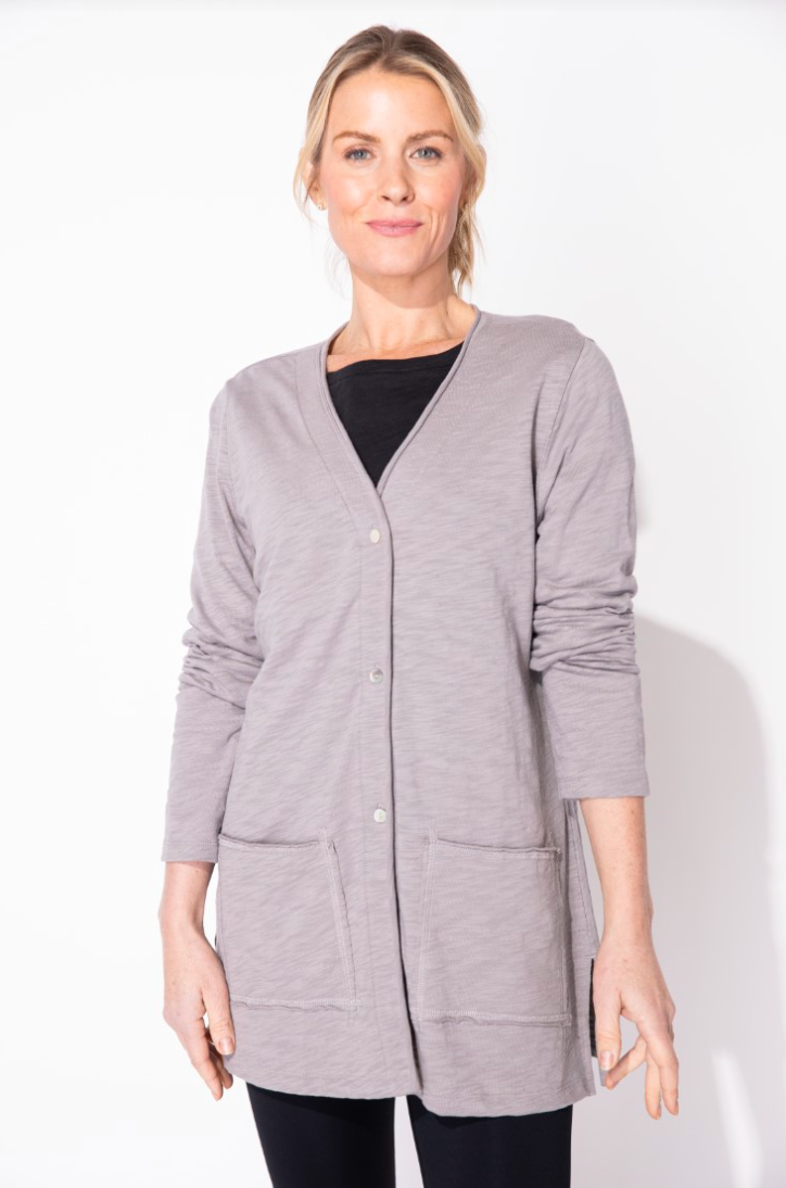 This new open cardigan style from Escape is made in the same soft cotton slub fabric. The long sleeves, make it a great layering piece for cool days and evenings. An easy fit with side slits for ease of movement and finished with patch pockets for all your essentials.