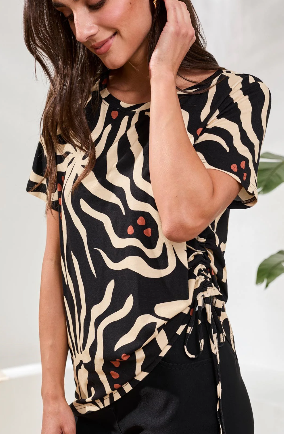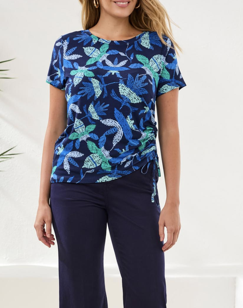 Eye-catching prints, a classic crew neck, and modern side ruching deliver a flattering, easy look in this stretch jersey top. Breathable, soft, and comfortable, it’s ideal for polished spring style, casual layering, or days on the move.