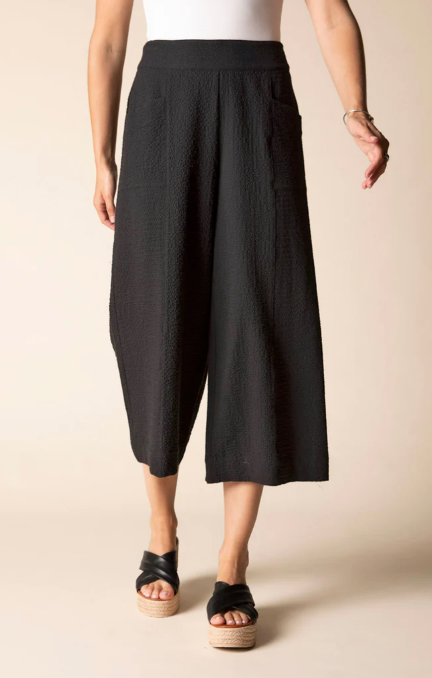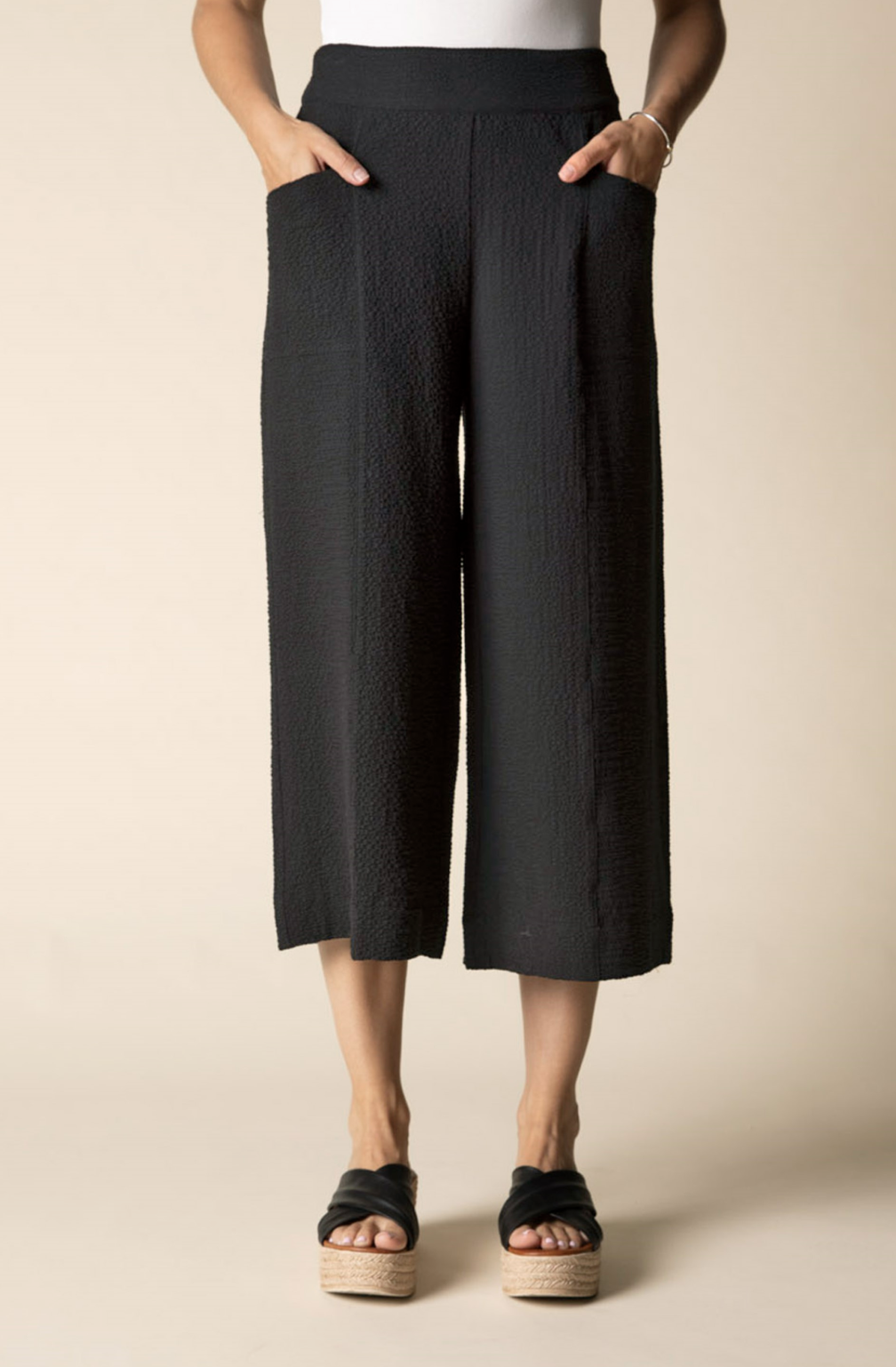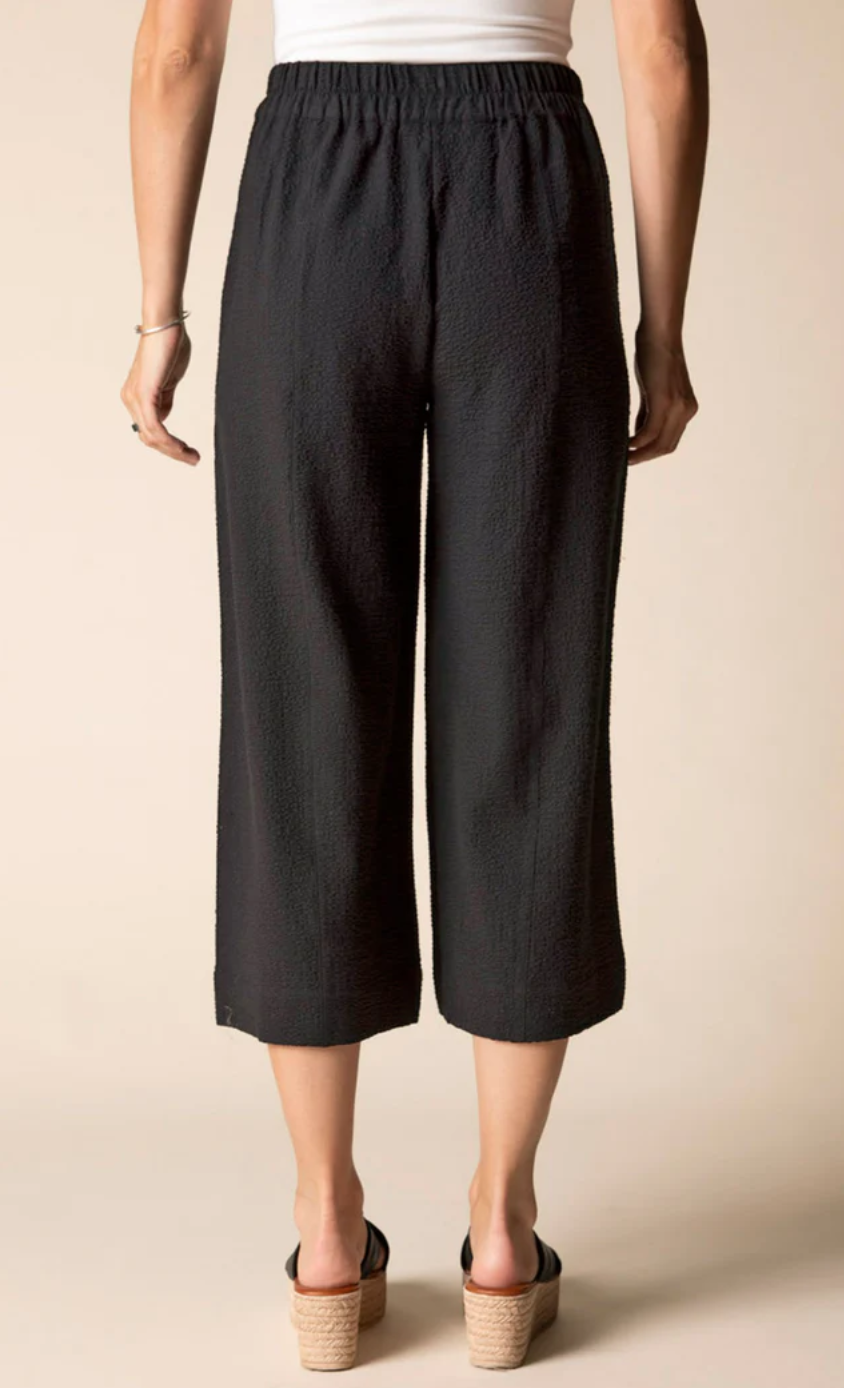 - Pucker weave fabric is the perfect stretchy, textured cloth for our Aria capri. Pull on waistband lays flat on the body. Slimming center front seams and angled built in pockets. Light and breezy yet polished and put together.