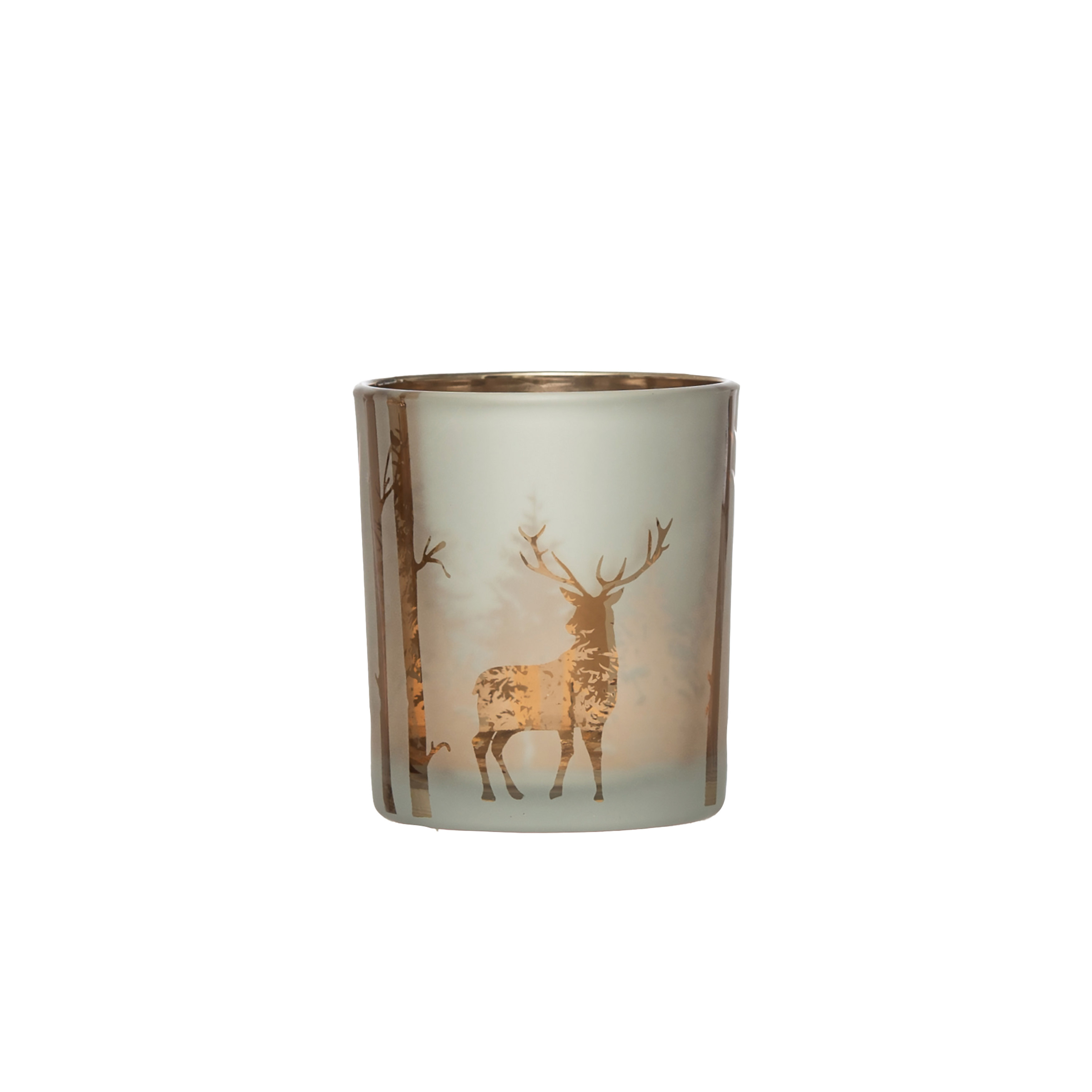 3-1/2" Round x 4"H Mercury Glass Candle Holder with Laser Etched Scene, Silver and Gold Finish