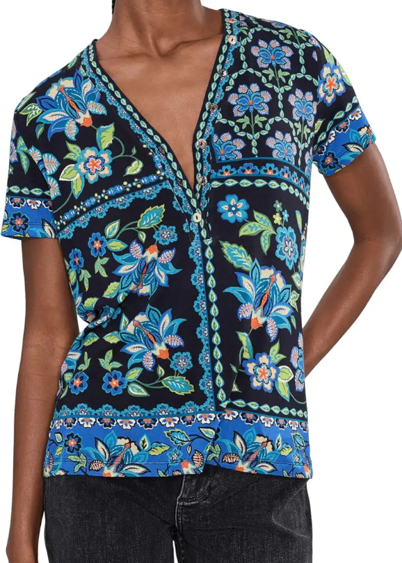 Rich jewel-toned florals and intricate borders give the Johnny Was® The Janie Favorite Button Neck Tee- Delmira a beautifully traveled, romantic spirit. Effortless yet striking, it's made for days when you want your look to feel expressive, confident, and quietly unforgettable.