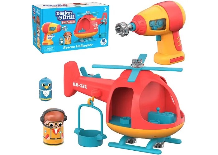 - Includes a Kid-friendly power drill toy, helicopter body with drill-activated winch and 4 snap-on parts, 5 bolts, and 2 Bolt Buddy figures. Drill requires 3 AAA batteries (not included).