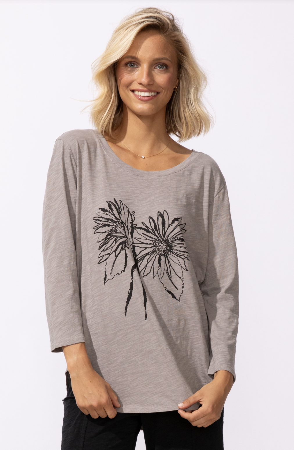 Easygoing and effortlessly stylish, the Destination Floral Fog Duo T-Shirt by Escape features a soft knit feel and a relaxed silhouette. Designed in the serene Fog colorway, this tee showcases a destination-inspired floral graphic that adds an artistic touch without overpowering your look. Comfortable and versatile, it’s perfect for everyday wear, travel days, or casual layering with your favorite jacket or cardigan.