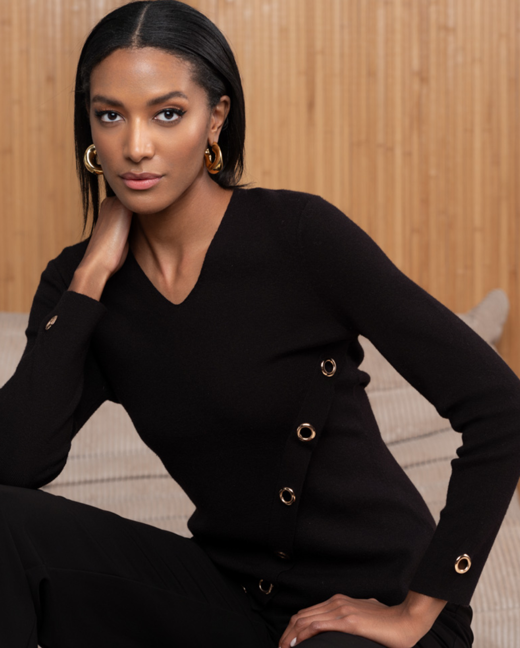 Add a touch of modern edge to your wardrobe with the Alison Sheri grommet sweater. This chic piece features bold grommet accents arranged in a striking diagonal pattern, creating a stylish and contemporary look. Crafted from soft, cozy fabric, it offers a comfortable fit that's perfect for all-day wear. Its versatile design makes it easy to dress up with tailored pants and boots or keep casual with jeans and sneakers. Whether you’re heading to the office, meeting friends for brunch, or enjoying a night out, this sweater brings effortless sophistication to any outfit.