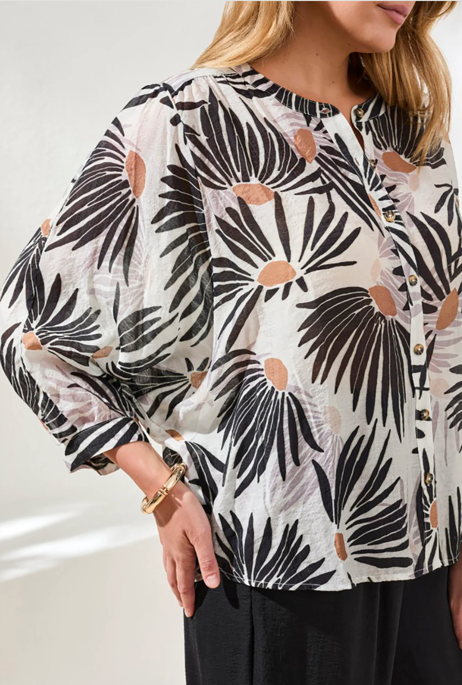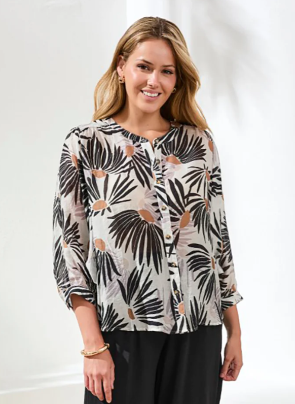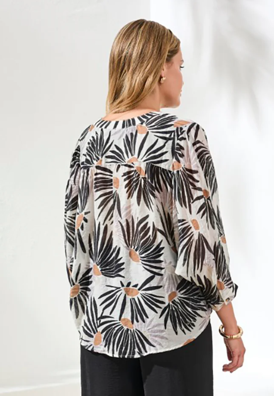 Float effortlessly from one place to another in our lightweight dolman sleeve blouse crafted from luxuriously woven fabric adorned in an elegant print. The notch neckline offers a touch of stylish breathability, while meticulously designed with fabric-covered buttons.