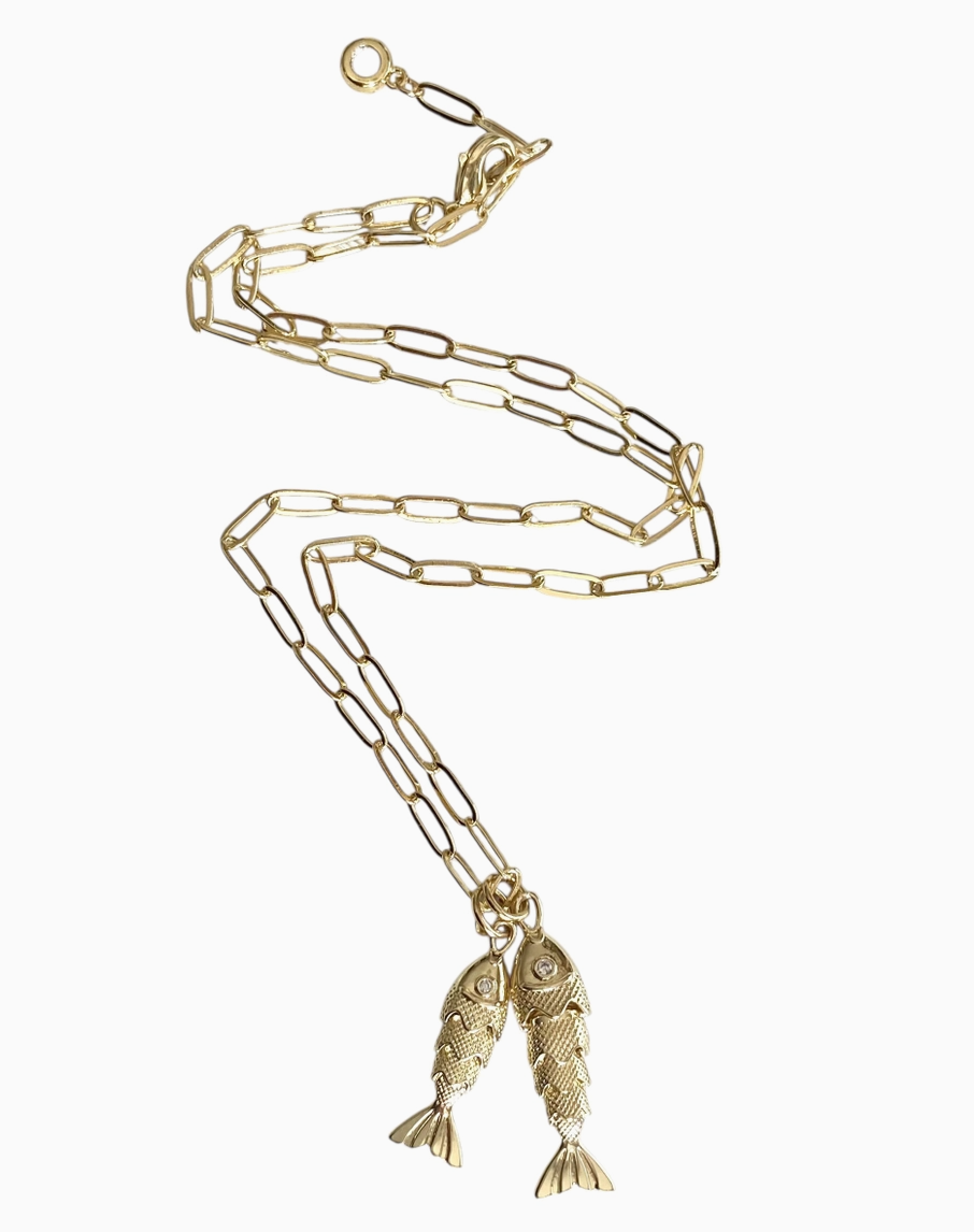Make a splash with our shimmering Double Gold Fish Pendant Necklace! Featuring two intricately detailed gold fish charms—one large and one small—this playful yet luxe design is full of personality and sparkle. The rhinestone eyes and textured scales catch the light beautifully, while the chunky paperclip-style chain adds a trendy touch. ? Symbolizes good luck, abundance, and transformation—perfect for gifting or keeping all to yourself! ✨ Features: • Two gold-tone fish pendants (small fish 25mm larger fish 36mm • Crystal detailing for extra shine • Trendy paperclip chain • Lightweight and easy to layer Chain Length: Adjustable up to 20” Material: Gold-filled 18k chain, rhinestone accents