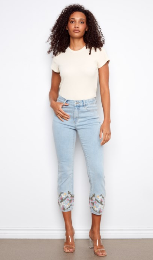 The Charlie B Embroidered Crop Slim Stretch Jean combines flattering fit with eye-catching detail. Designed with a slim silhouette and cropped length, these jeans feature comfortable stretch for easy, all-day wear. Delicate embroidery adds a feminine, elevated touch, making them perfect for dressing up a casual look or pairing with your favorite everyday tops. Versatile and effortlessly chic, these jeans transition seamlessly from day to night.