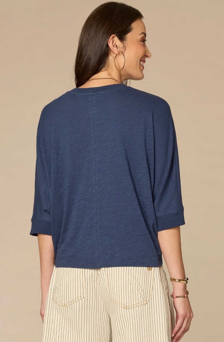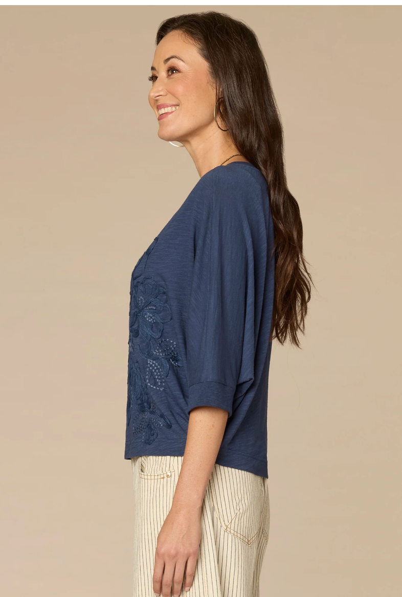 This knit top is sure to become a repeat go-to. It’s designed with three quarter dolman batwing sleeves, a classic scoop neck, and floral embroidery.