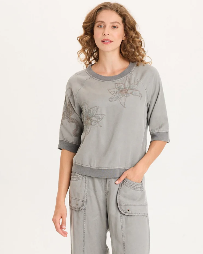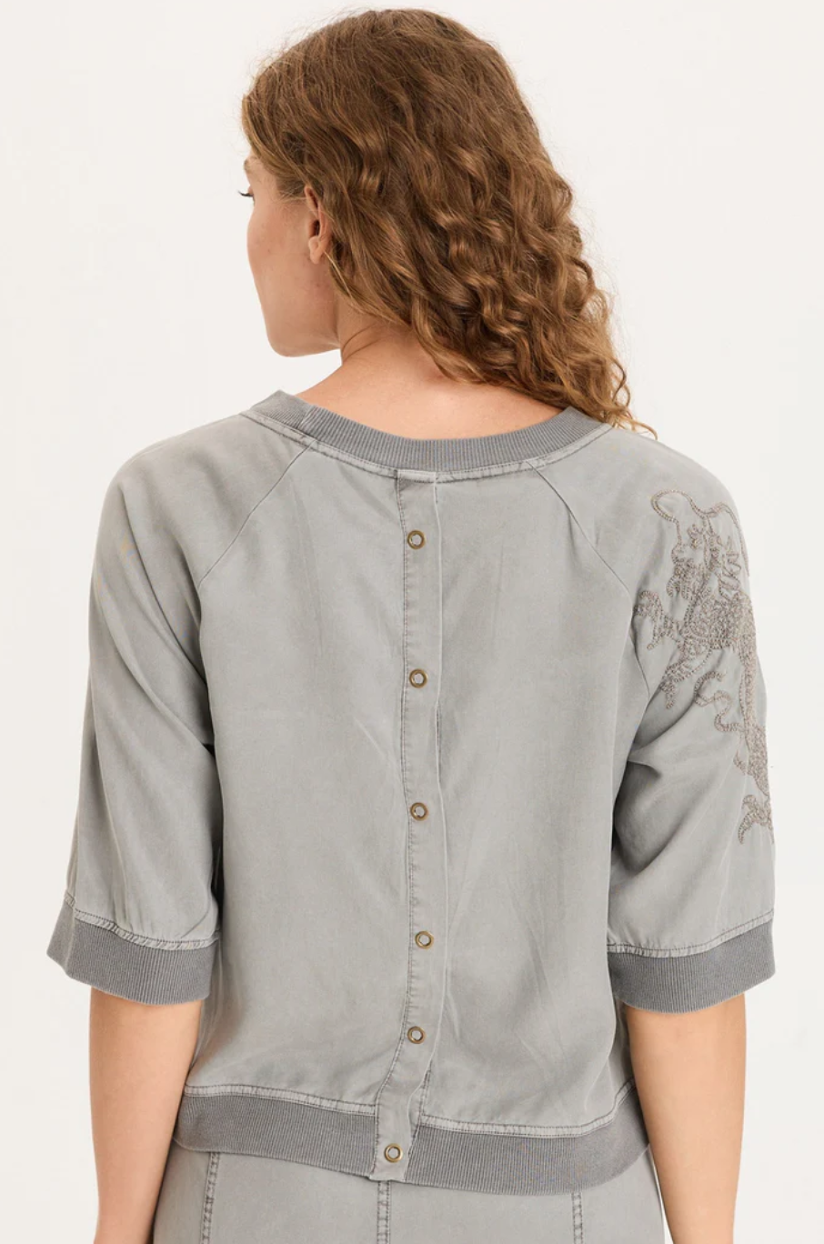 Embroidered floral and scale motif dance over this elongated raglan sleeve top. Featuring a brass snap-up back detail.