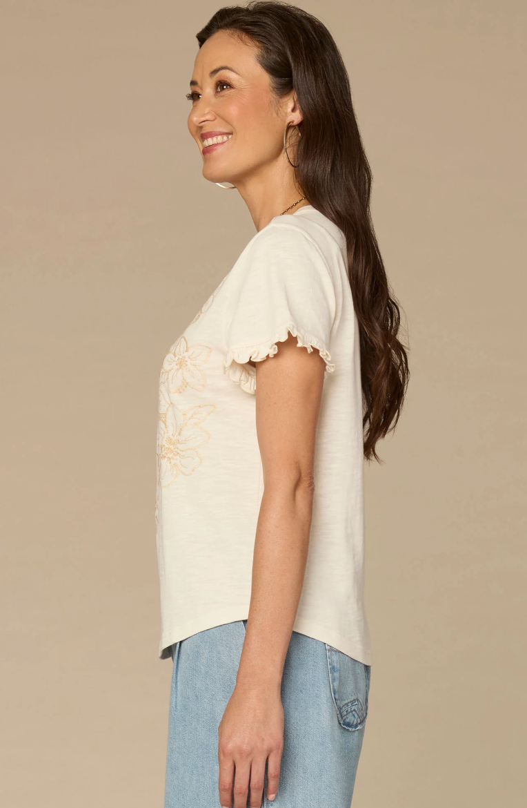 A clean and crisp classic, this knit top goes with everything. It’s designed with short ruffle sleeves, a crew neck, and an embroidered front with a floral design for visual interest.