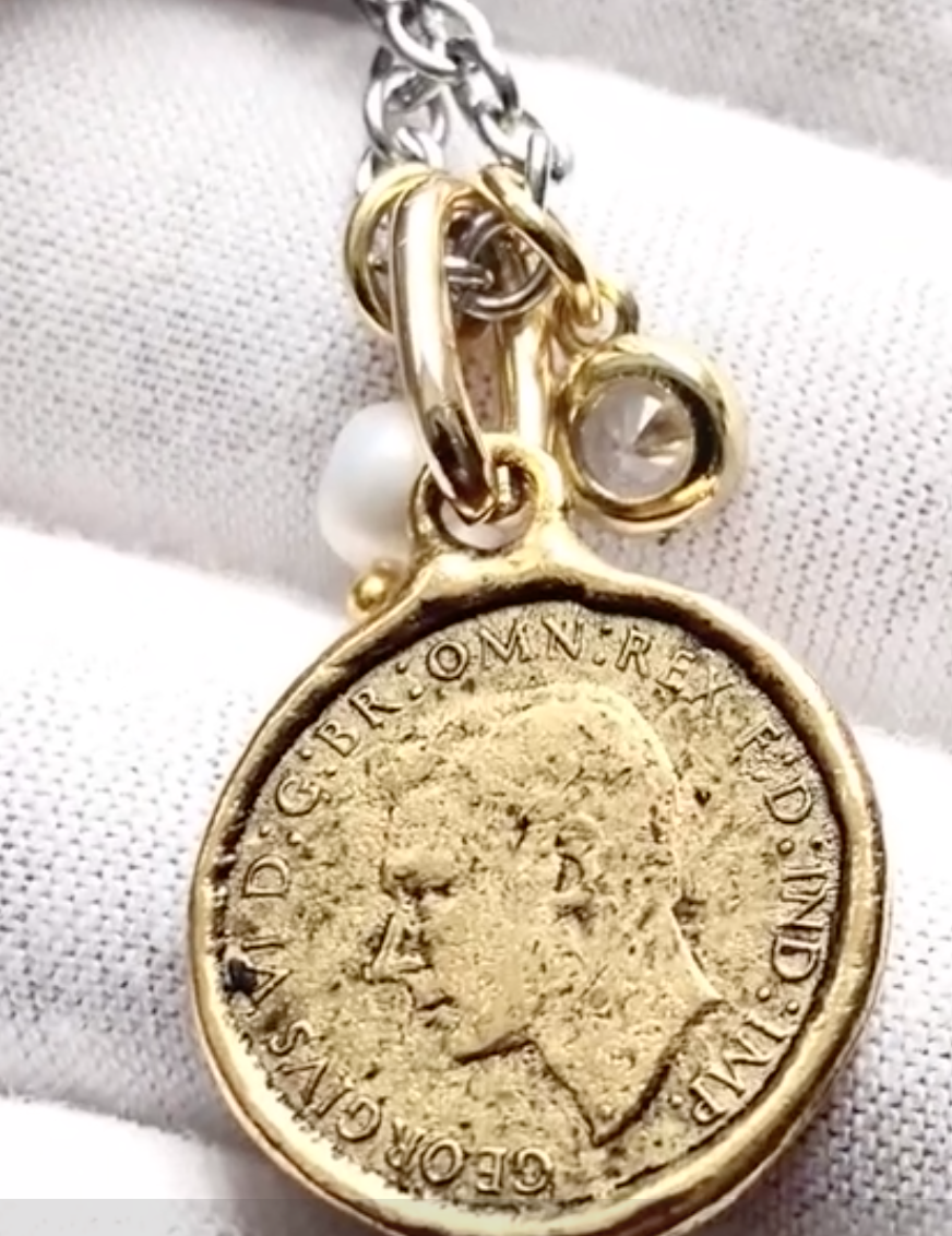 This small coin pendant was hand casted using a real English farthing coin. It is reversible. The handmade cluster features a genuine fresh water pearl. Non tarnishing stainless steel chain. 18””