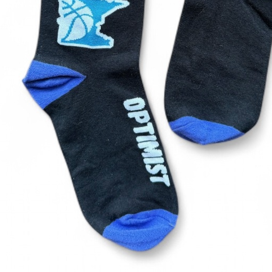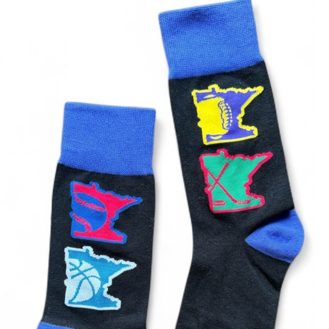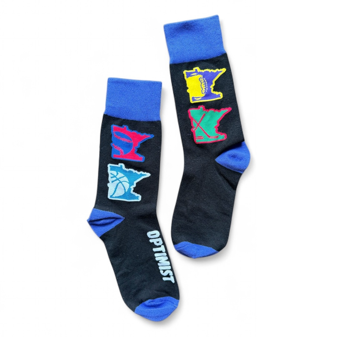 This awesome sock features the colors of four of Minnesota's most loved sports teams - Vikings Football, Wild Hockey, Twins Baseball, and Timberwolves Basketball. Four Minnesota symbols showcase a football, baseball, basketball, and hockey stick and puck. Win or lose, Minnesota fans always stay optimistic, and this sock brings the Minnesota nice with the word "Optimist" along the foot. This sock is perfect for showcasing your own relentless pride or gifting to the Minnesota sports fan in your life.