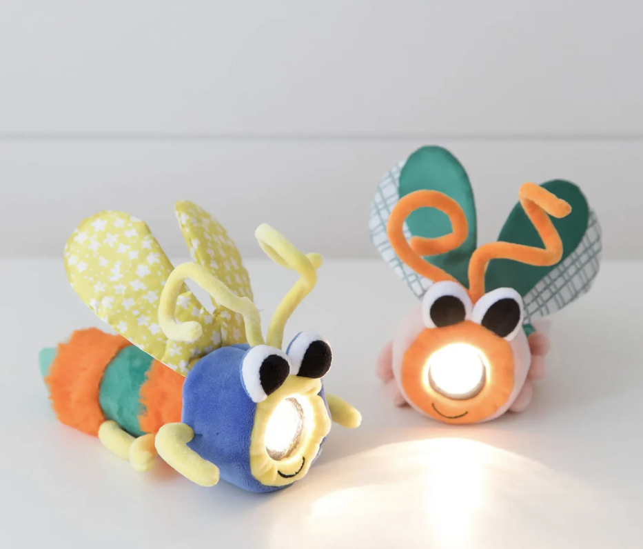 Is it a bug? A flashlight? It's both! Flyer the flashlight bug is a child-size flashlight with a removable plush exterior. Light your way through playtime adventures using the on/off button under the wings. Flyer comes with two replaceable AA batteries. To replace the batteries, lift the hook and loop closure located under the wings and pull the fabric covering away from the flashlight face. Twist the head of the flashlight counter-clockwise to access the battery compartment.