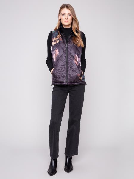 Discover the stylish versatility of this reversible quilted vest. One side has a trendy floral design, while the other boasts soft faux fur in classic black, perfect for various occasions. The functional welt pockets give you practicality without sacrificing style. It provides comfort & warmth and is a great addition to your fall wardrobe.