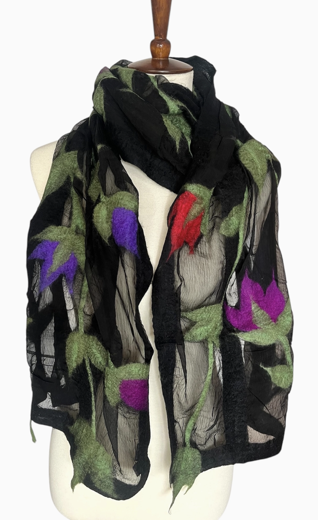 A winding multicolored flower vine of felt growing through a black chiffon base. A light and dramatic piece worn throughout the year. This scarf is made of merino wool felted onto a poly chiffon base. Handmade, fairtrade from Nepal.