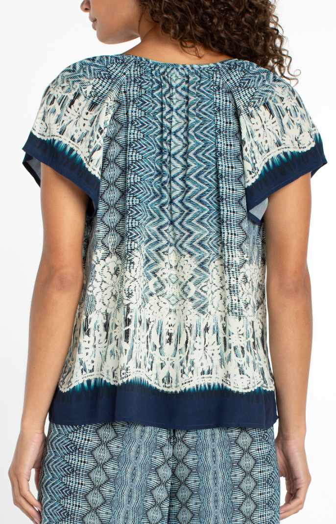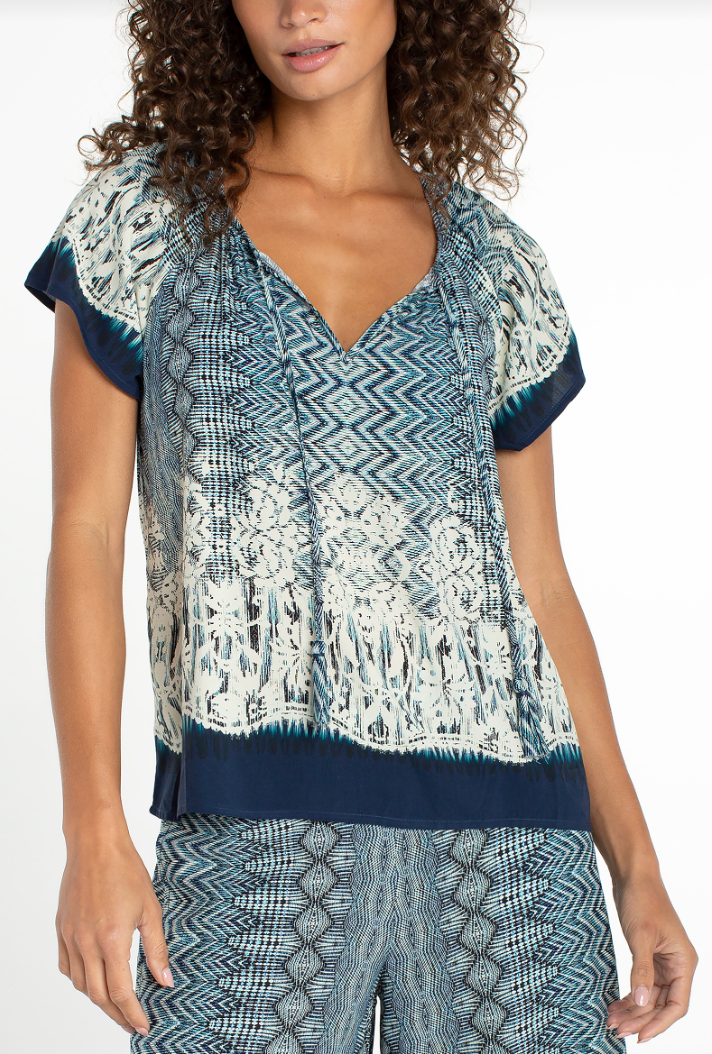 This charming flutter sleeve woven top combines light, breezy fabric with a feminine touch. Featuring shirring details for a flattering fit, a front tie with tassels, and an exclusive Liverpool print make this the perfect warm weather top.