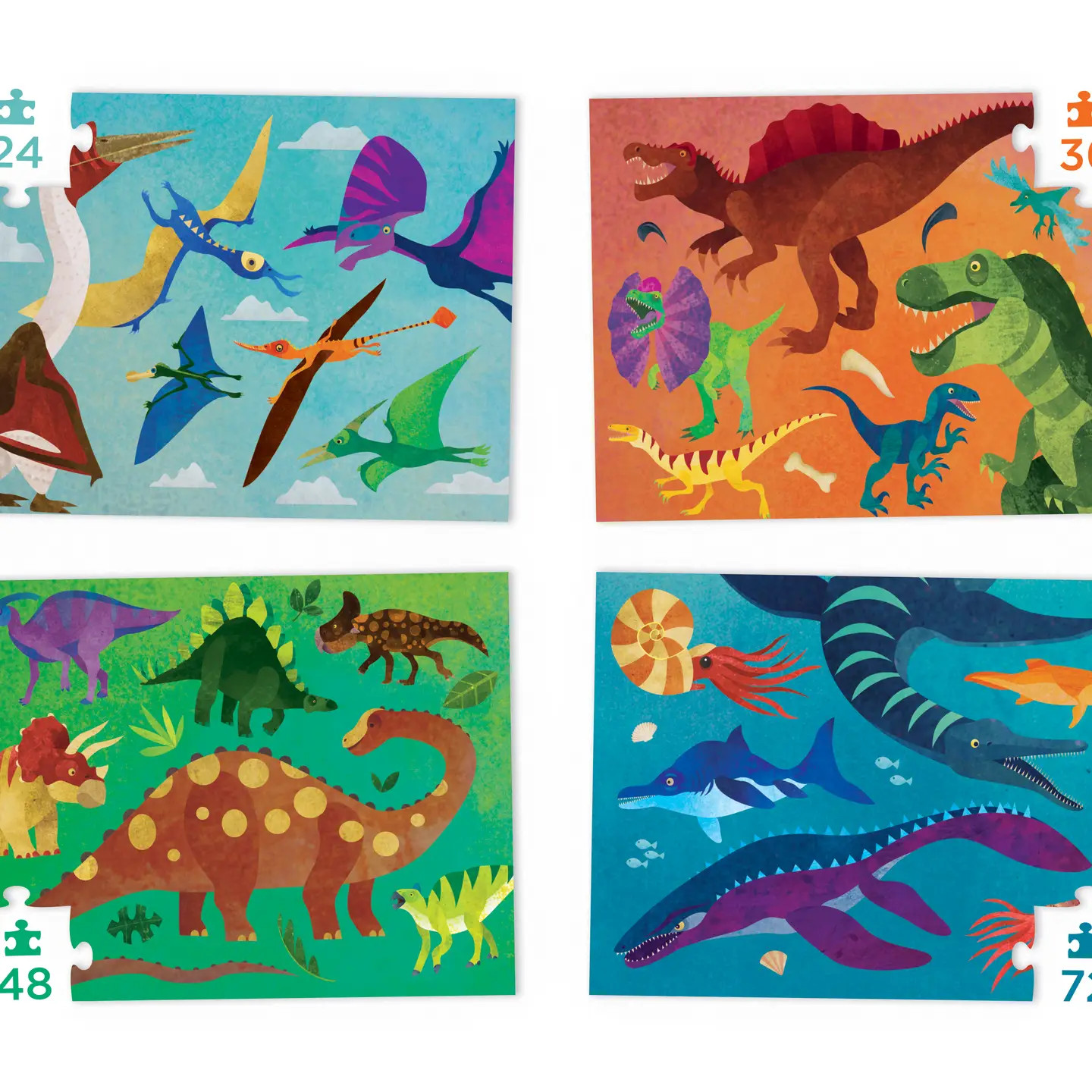 Four puzzles 24pc, 36pc, 48pc, and 72pc Four graduated puzzles in great themesFour puzzles promote a sense of mastery and builds confidenceEach puzzle is color coded on the back for easy sortingMade of recycled materials and soy-based inks