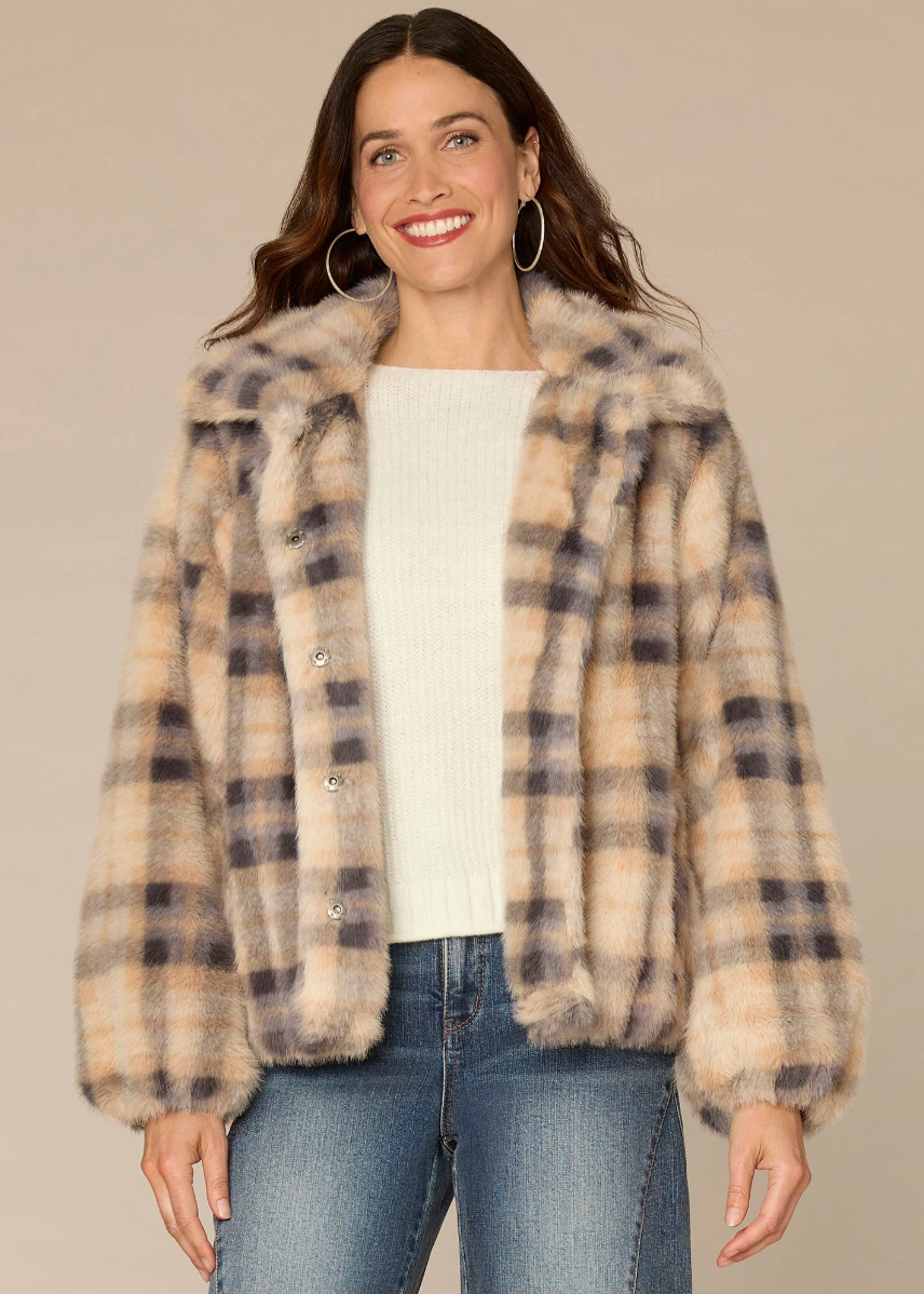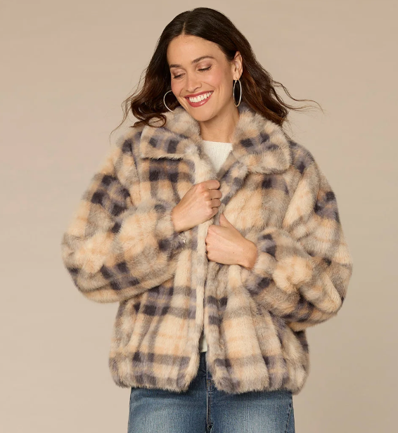 Get ultimate comfort in this soft faux fur bomber jacket. With long blouson sleeves, a button front, side pockets, and a plaid print, it’s cozy, on-trend, and endlessly versatile.