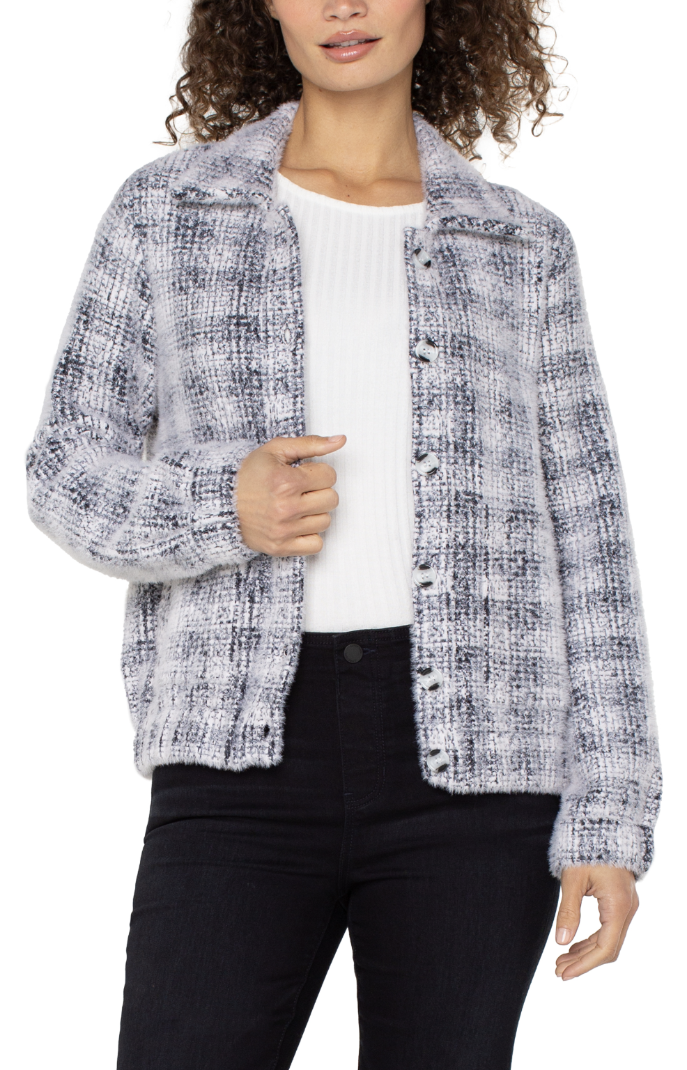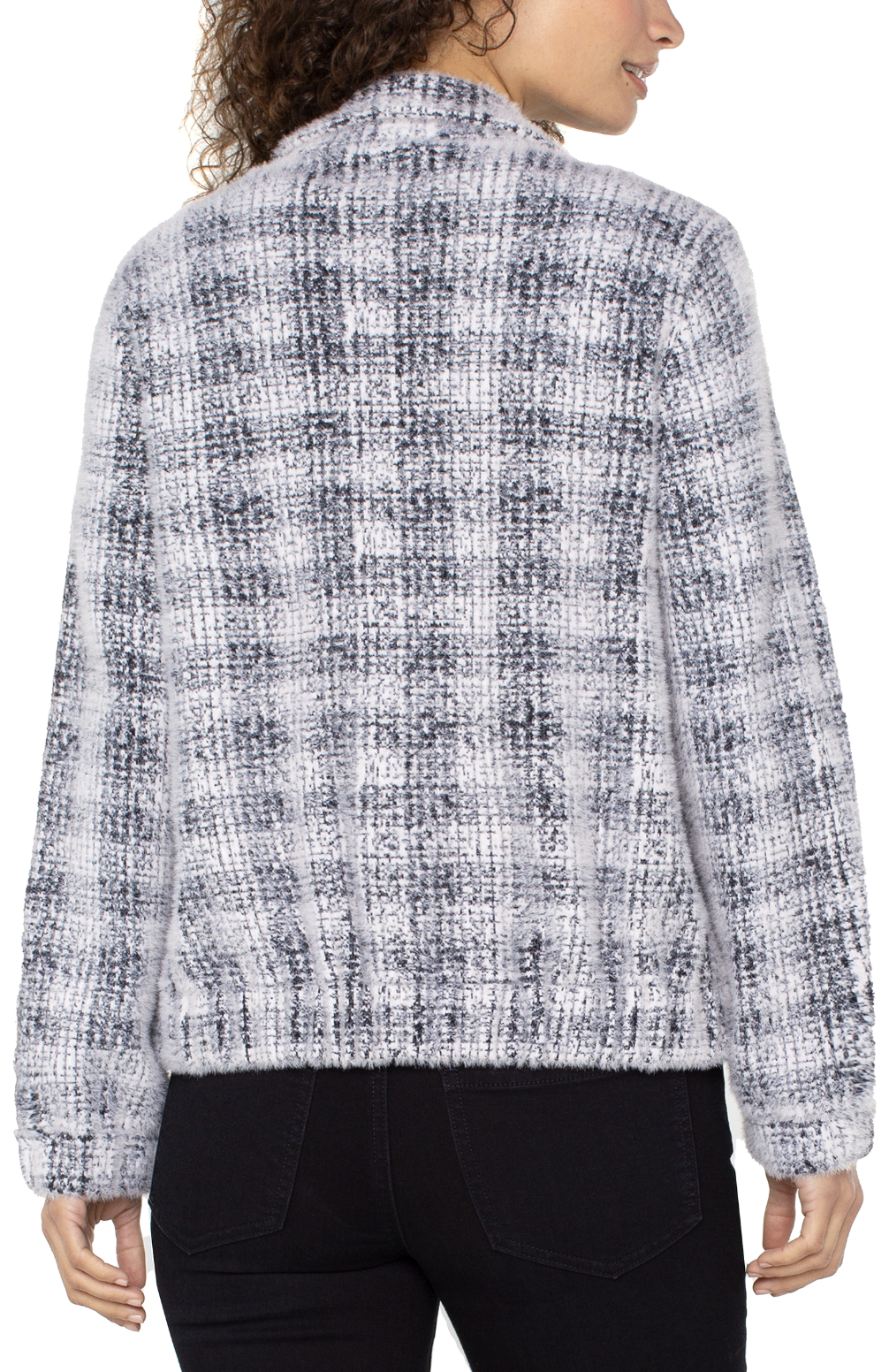 Layer up in the cozy softness of this fuzzy plaid sweater that takes its styling cues from old-school bomber jackets.