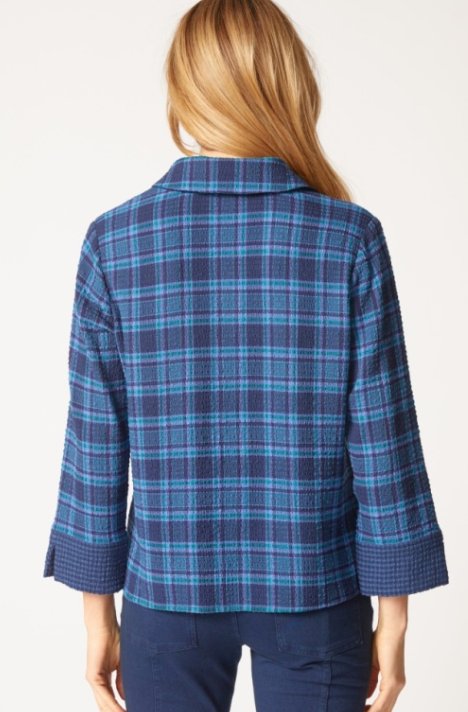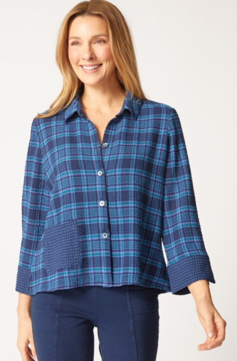 This soft, textured twill blouse gives classic plaid a modern update. Designed in navy, teal, and heather tones, it reimagines traditional tartan with playful touches like a single patch pocket and split cuffs in a coordinating check for subtle contrast. Finished with a button-front, long sleeves, and a notched A-line hem that sits at the hip, it offers a fresh, contemporary spin on timeless style.