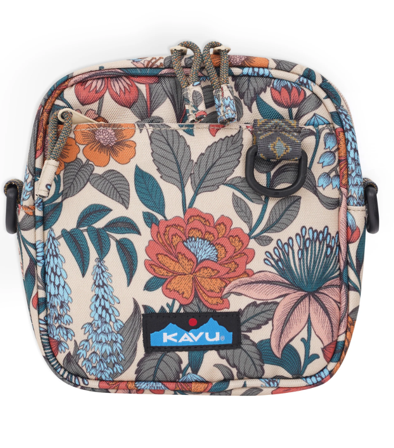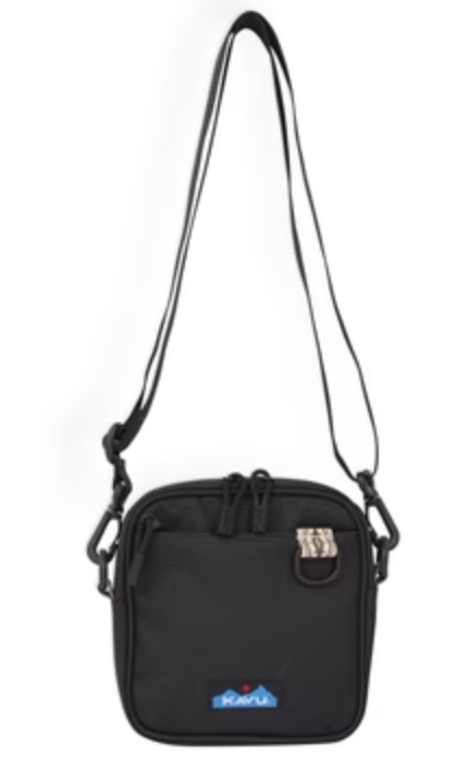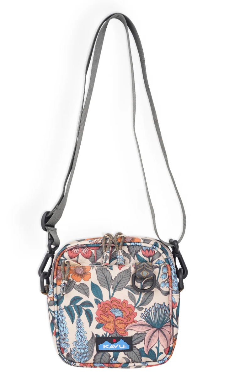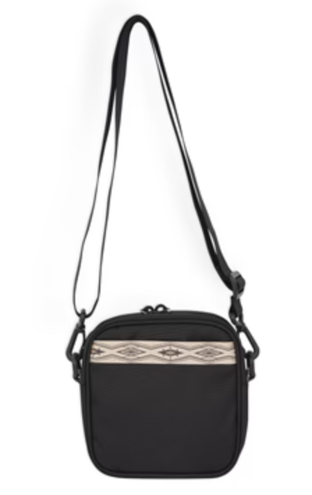Cross body bag with adjustable webbing shoulder strap that can detach, plastic d-ring and snap hook hardware, main compartment with zip closure, front