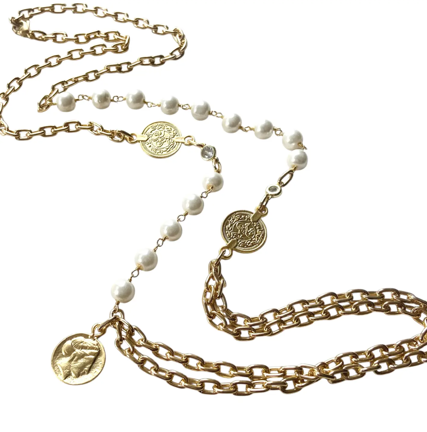 Whether worn solo as a statement coin pendant necklace or layered with other pieces, its rich gold tones and creamy pearls bring timeless elegance to any outfit. Perfect for pairing with both daywear and evening ensembles, this luxury gold necklace exudes sophistication.