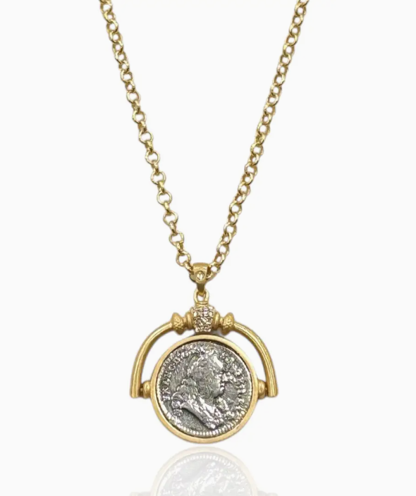 PIERRE & SOLEIL draws inspiration from the sun-washed architecture of the South of France. Sculptural silhouettes echo timeworn stone and clean lines, while warm finishes reflect Mediterranean light. Effortless and modern, each piece captures the balance of structure and glow—designed to be worn from sunlit days to golden evenings. 14K gold plated Sterling silver (vintage silver) plated replica coin 14K gold plated replica coin Pendant size 16.5mm / .6" Pavé cubic zirconia Lobster claw closure 28" length Spinner pendant (coin can flip to show either side on the front of the necklace)