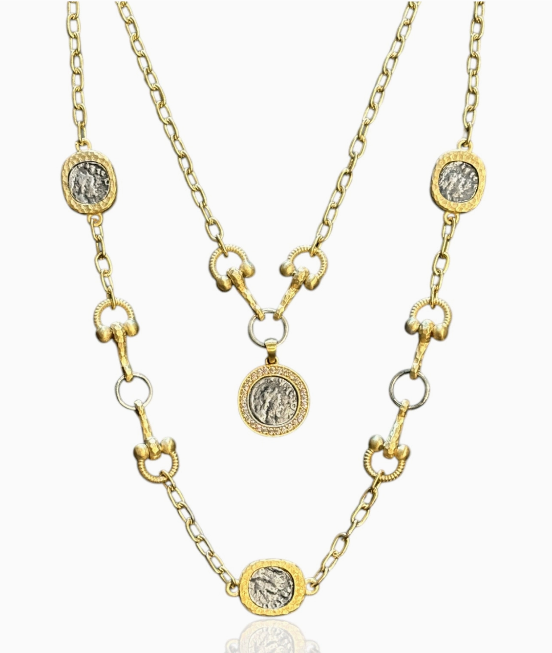 Each coin holds a unique history, which can be seen on our Coin History page. The coins in her designs are reproductions or sections taken from the originals.
