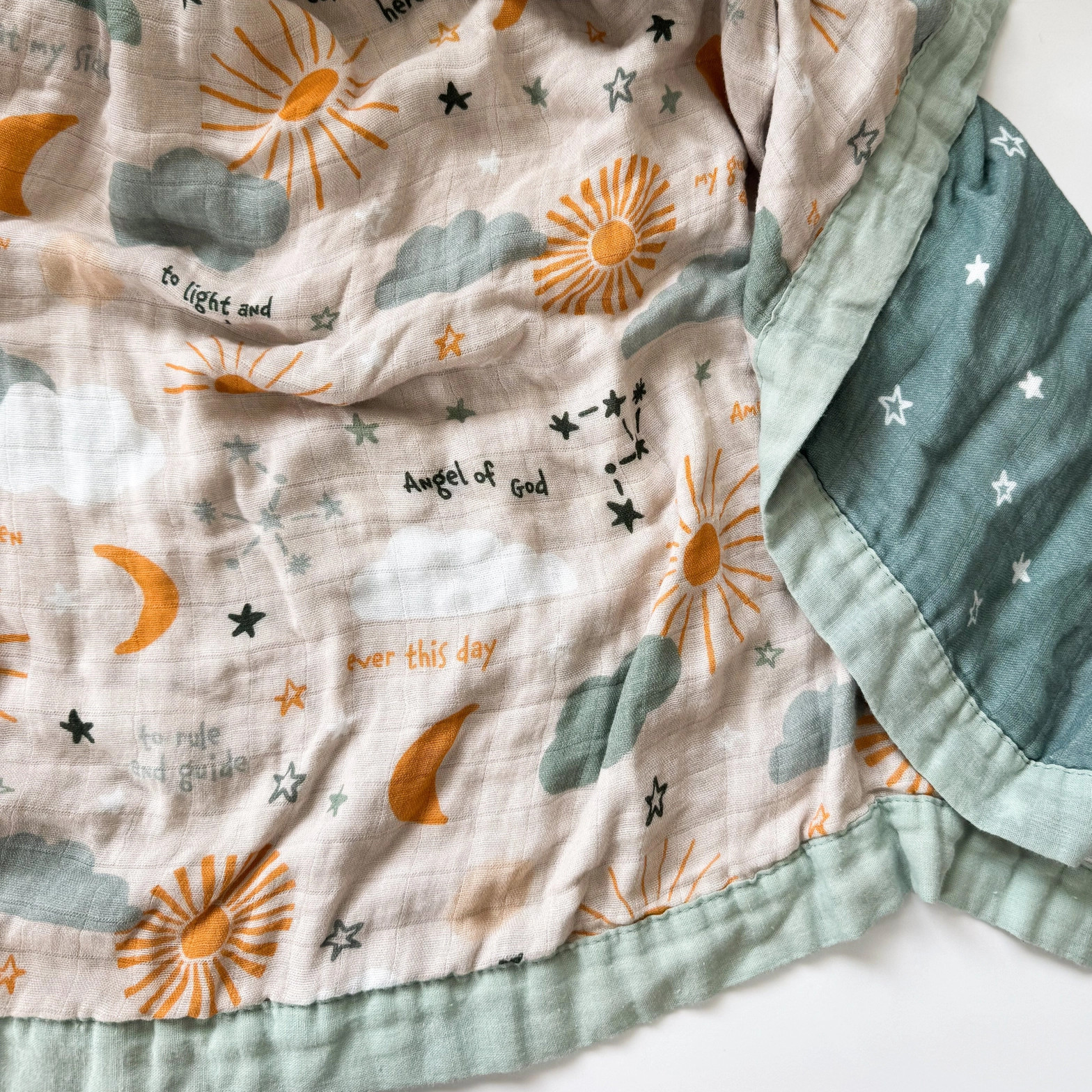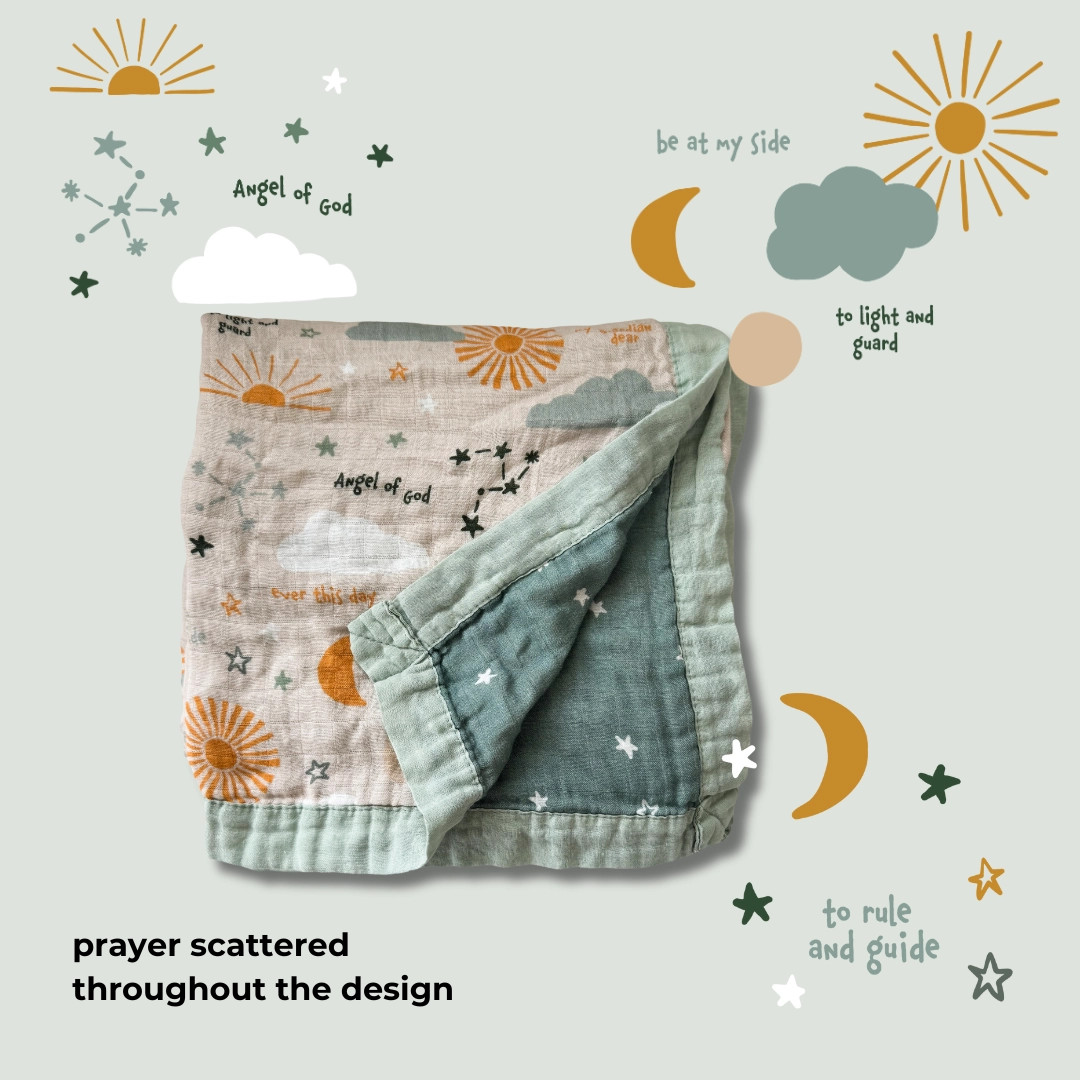 * Multi-Functional: More than just a swaddle, it transitions effortlessly from a cozy wrap to a nursing cover, stroller shade, tummy time blanket, or a soft comfort companion. * Premium Fabric: Made from a blend of 70% bamboo and 30% organic cotton, offering exceptional softness and lasting durability. * Original Artwork: Each swaddle showcases original, faith-inspired artwork, adding a special touch that celebrates your little one’s journey in faith.